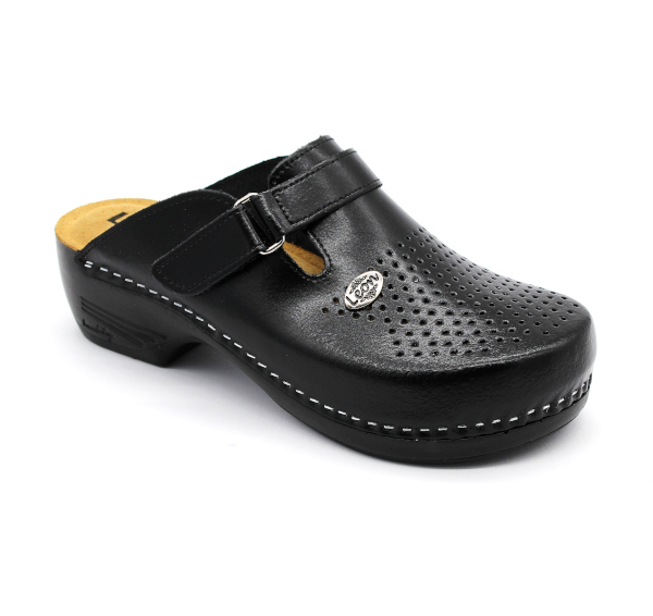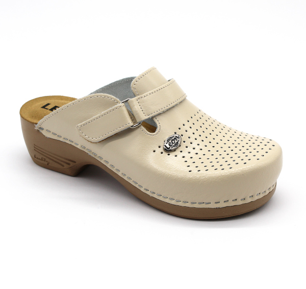 Damenlederclogs mit Kunststoffsohlen. An der Seite befindet sich ein Klettverschluss, um die Fülle einzustellen. Die Innensohle ist weiches, schwammiges Leder. Durch das natürliche Material und die Perforation des Obermaterials ist er gut belüftet. Entwickelt für den täglichen Gebrauch auf der Straße, zu Hause oder bei der Arbeit (Ihre Füße werden nach stundenlangem Laufen nicht müde).